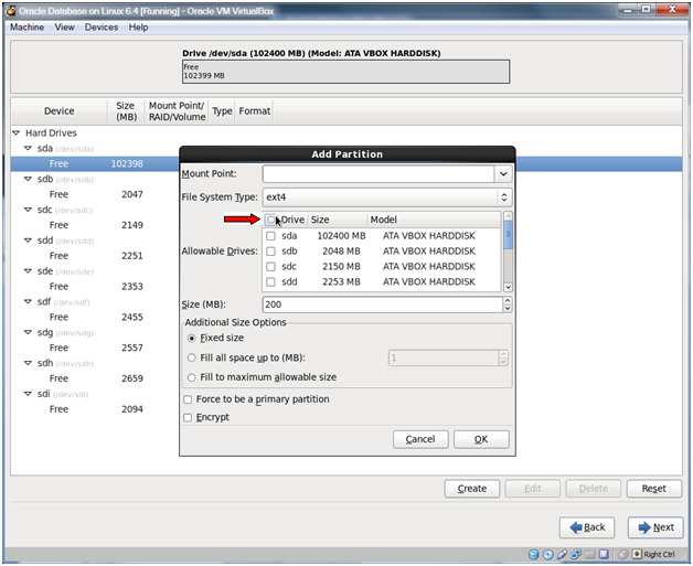 Use the Mount Point dropdown and choose / as the mount point. Again, deselect all the drives and check sda. Choose Fill to maximum allowable size in the Additional Size Options box. Check the Force to be a primary partition box and click OK.