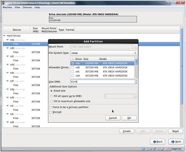 Change the File System Type to swap, check sda, and set the size to 6144 and click OK.