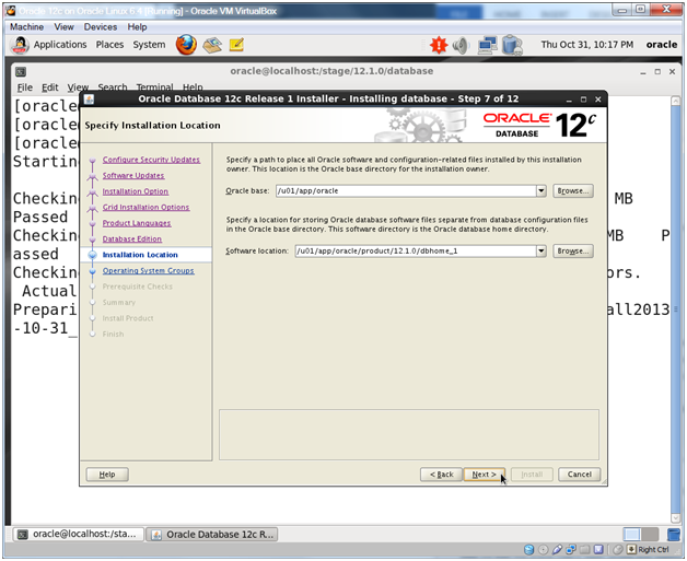 Confirm that Oracle base is /u01/app/oracle and Software location is /u01/app/oracle/product/12.1.0/dbhome_1. Click Next.
