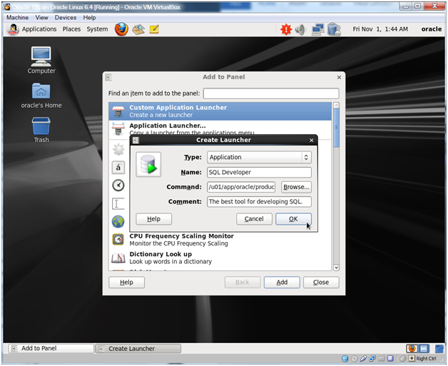Oracle Database 12c on Oracle Linux 6 – Step 29: Create a Link to SQL Developer and Database Connections < Previous Post – Next Post > Oracle Database 12c on Oracle Linux 6 – Step 31: Enjoy a frosty beverage!