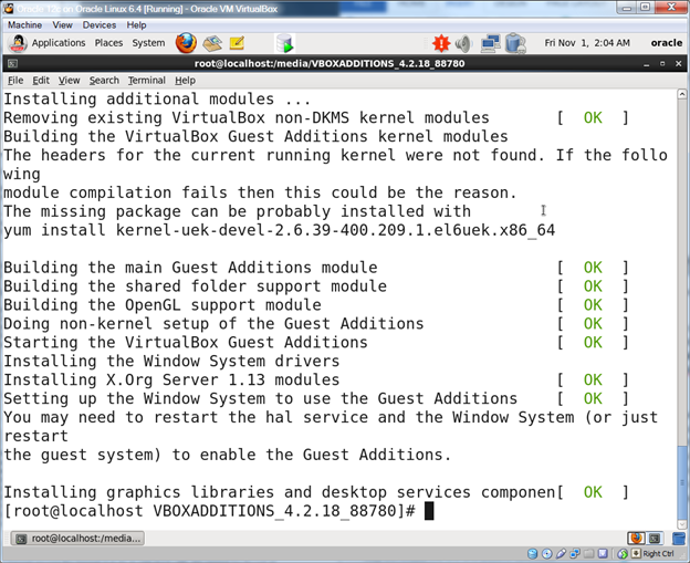 If you get a failed message it’s most probably because your kernel doesn’t match the kernel sources which usually means that your yum update kernel-uek-devel command from earlier didn’t work correctly. Recheck your commands from Step 9 to make sure you did everything correctly.