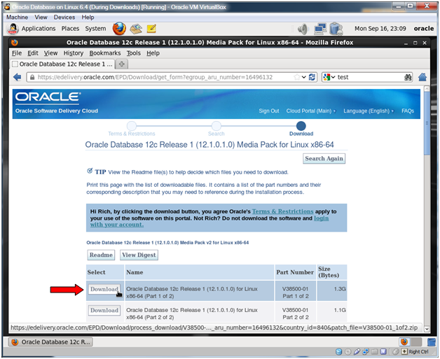Click the Download button for Oracle Database 12c Release 1 (12.1.0.1.0) for Linux x86_64 (Part 1 of 2).