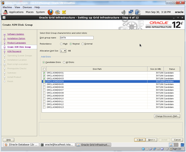 If you are not using ASMLib on Oracle Linux during this step you’ll have to use the Change Discovery Path… button and navigate to /dev/oracleasm/disks/ to find your ASM disks.
